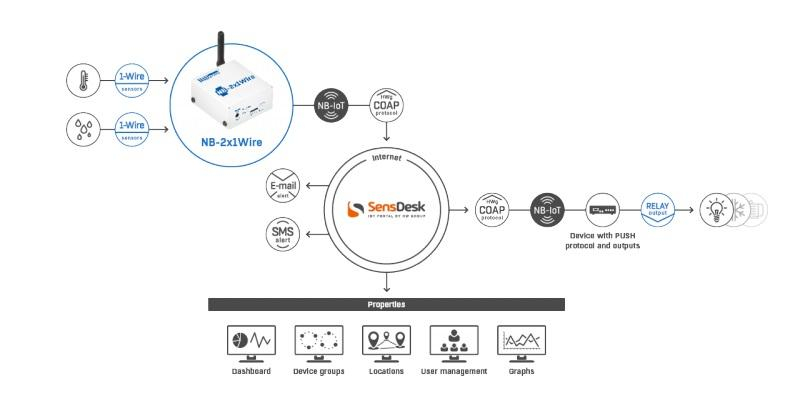 Jednoduché zařízení pro dálkový monitoring teploty, vlhkosti a dalších veličin na odlehlých místech. Připojení přes Narrowband IoT. Umožňuje připojení teploměrů, vlhkoměrů nebo čidel jiných veličin prostřednictvím sběrnice 1-Wire.