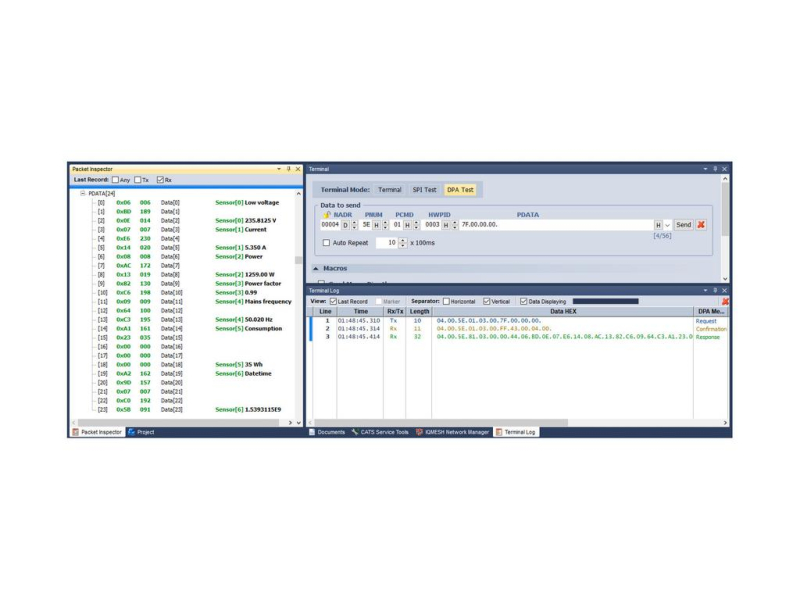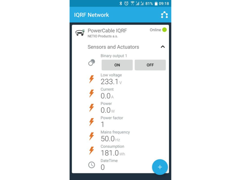 Using the Smart connect function, PowerCable IQRF can be connected to the IQRF wireless network. The DPA protocol can be used to control the output or read the measurements (V, A, kWh, W, Hz, TruePF). PowerCable IQRF is constantly powered, so it also acts as a message repeater in the IQRF MESH network.