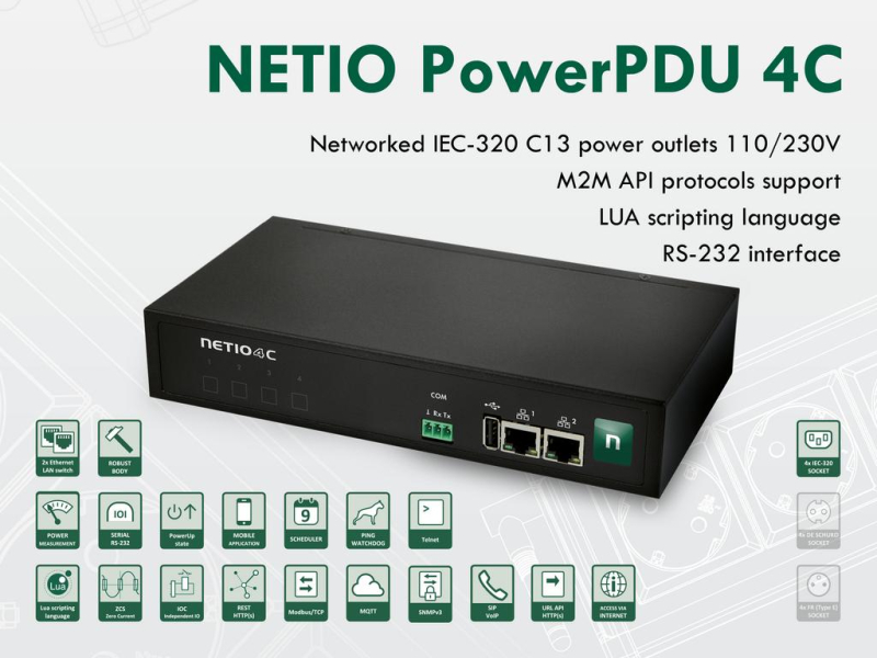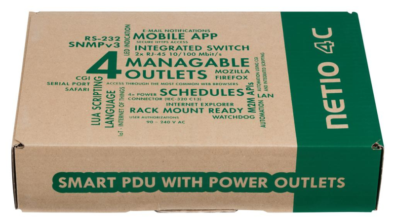 NETIO PowerPDU 4C supports a high level of network security. The configuration of the power distribution unit with electric meter is protected using a separate password, and HTTPs is supported. Individual M2M API protocols are enabled or disabled individually, and support either HTTPs, or at least IP address filtering.