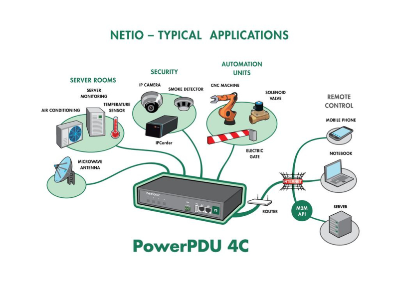 PowerPDU 4C offers an open M2M API with 13 different M2M protocols that can be used for energy consumption metering and control of individual outputs. NETIO 4x smart power outlets can be connected to multimedia AV systems, cloud services (e.g. MS Azure IoT hub), the Node-RED environment, or smart home apps.