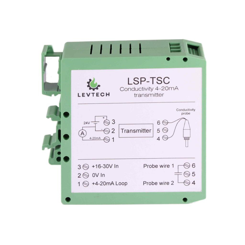 The conductivity sensor consist of two electrodes and the transmitter measures the conductivity between them and transmits the measured value to the processing unit using a 4-20mA 2 wire current loop communication. For example if we place the sensor into a salt-water the conductivity is high because the salt water is a good conductor and current can flow between the electrodes. If we place the sensor in purified water, which doesn’t conduct current, the conductivity is low.