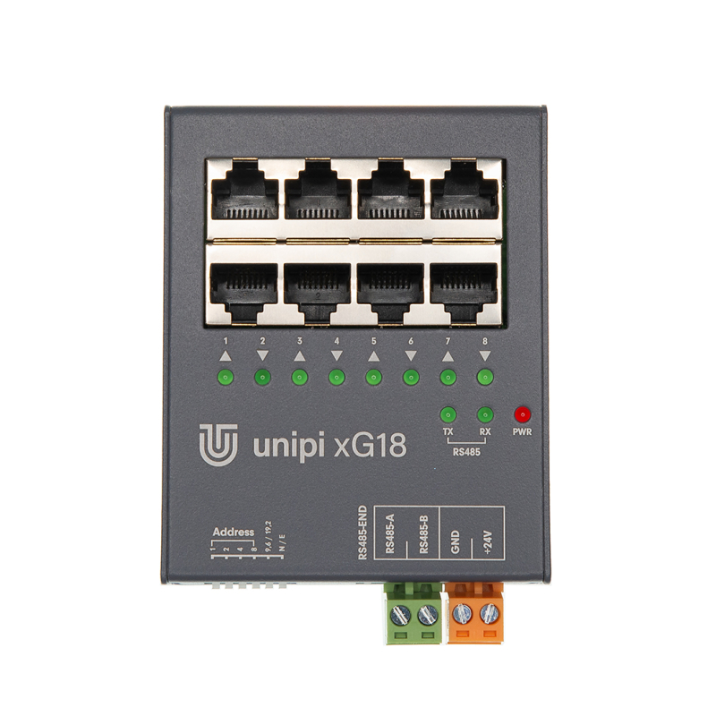 Unipi xG18 is an extension module for connecting up to eight Unipi 1-Wire temperature sensors (RJ45 connector). For communication with the control system, the module uses the RS-485 serial interface and the Modbus RTU protocol.