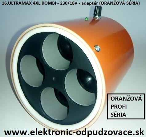 Je to válec dlhý 16 centimetrov, priemer 14 cm. Je to kombinácia zvukového a dvoch rôznych ultrazvukových signálov, kombinuje výhody zvuku a ultrazvuku, pričom ultrazvuk ide nepretržite a hlasitosť zvuku sa dá plynule nastaviť, alebo úplne vypnút. Tento PROFI odpudzovač má dva rôzne ultrazvukové-(nepočuteľné) signály a regulovateľný zvukový signál (od nuly do maxima.) , preto je účinný na živočíchy, ktoré reagujú na ultrazvukový signal, ale aj na tie ktoré reagujú na zvukový signal. Preto má ULTRAMAX 4XL KOMBI všestranné použite a je jediný na trhu svojim VEĽKÝM výkonom a univerzálnosťou. Prístroj je napájaný špeciálnym adaptérom na 230/18V, ktorý je spínaný - skratuodolný teda BEZPEČNÝ. Prístroj umiestnime na požadované miesto, nastavime úroveň zvukového signálu a necháme trvale pôsobiť. Prístroj vydáva ultrazvukový, nepočuteľný signál s cyklicky premenlivou frekvenciou a regulovateľny zvukový signál. Prístroj je účinný na MYŠI, POTKANY, PLCHY, KUNY, JELENE, SRNY, MAČKY, LÍŠKY, LASIČKY, TCHORY, JEŽKY A NETOPERE !! Maximálna hladina ultrazvuku a zvuku : 106 dB
