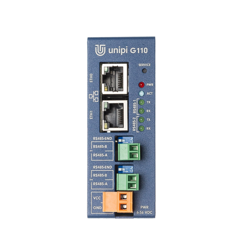 Unipi Gate G110 is a programmable Ethernet / RS485 Linux gateway and logic controller designed for industrial automation, building management systems and other automation projects. Thanks to sufficient computing power, software openness and favourable price this IoT platform is applicable as a data logger in SCADA or MES control systems, or in cloud services within Smart City, Smart Factory and IoT/IIoT projects. Last, but not least, the gateway also represents an easy way to modernize older installations.